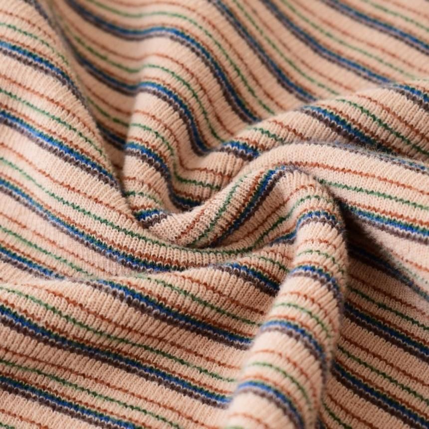 マルチカラーの細いピッチのボーダーデザインとタオル生地のような起毛した柔らかい肌触りのヘヴィーオンスな生地感が特徴的なロングスリーブTEE。