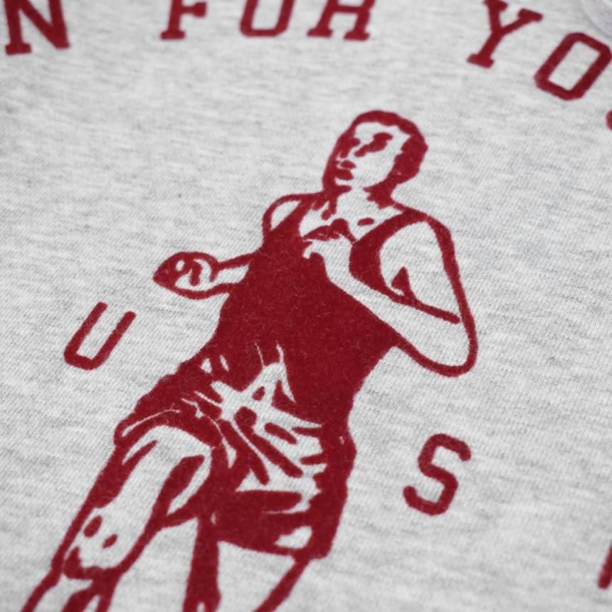 バックとフロントにフロッキープリントが施されたどちらから見ても目を引くクルースウェットです。