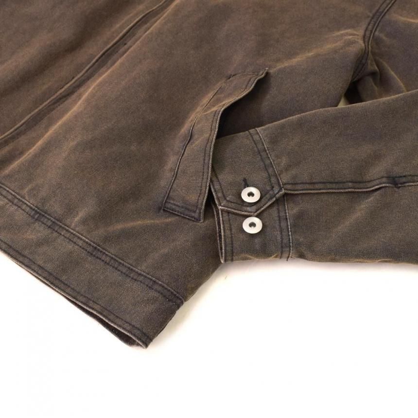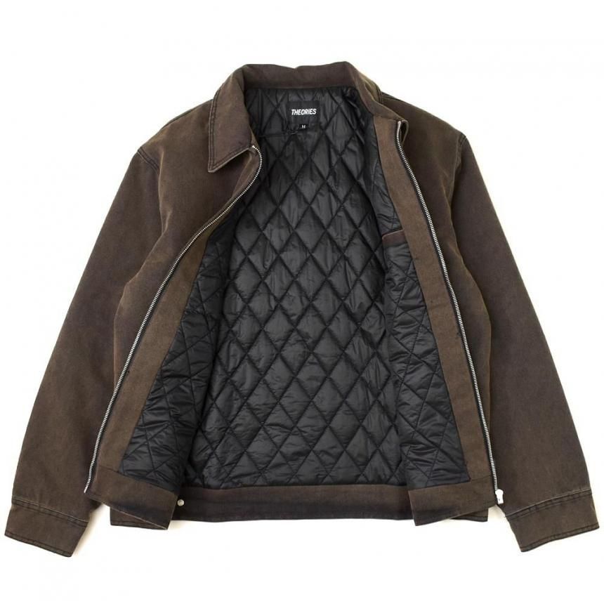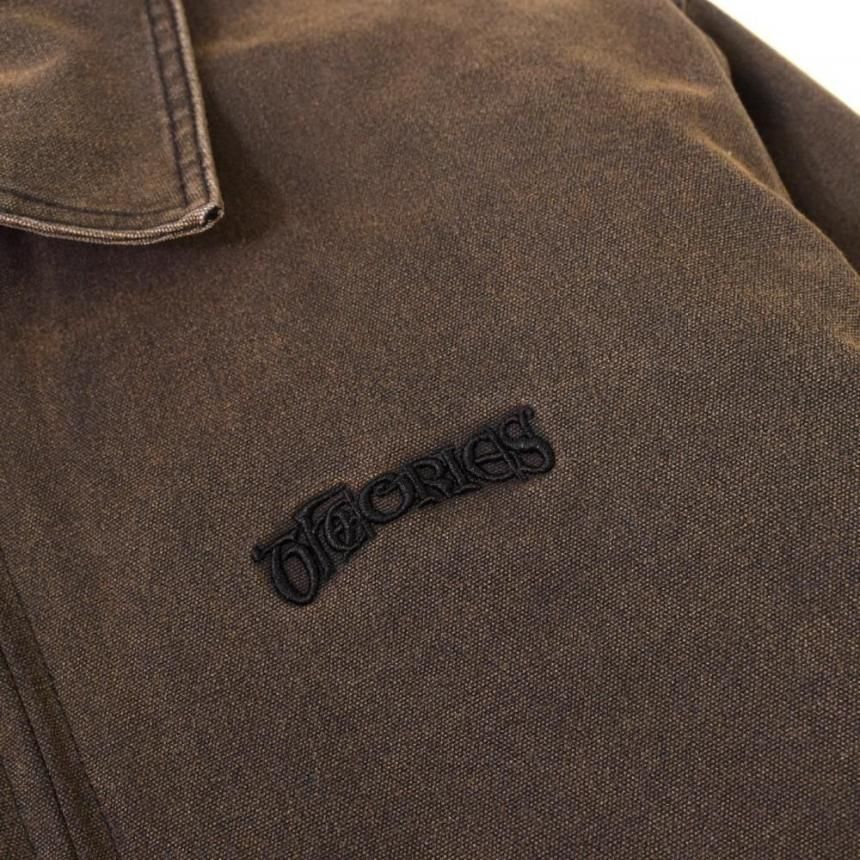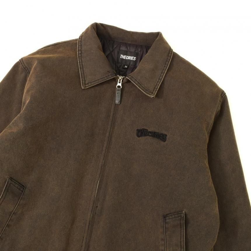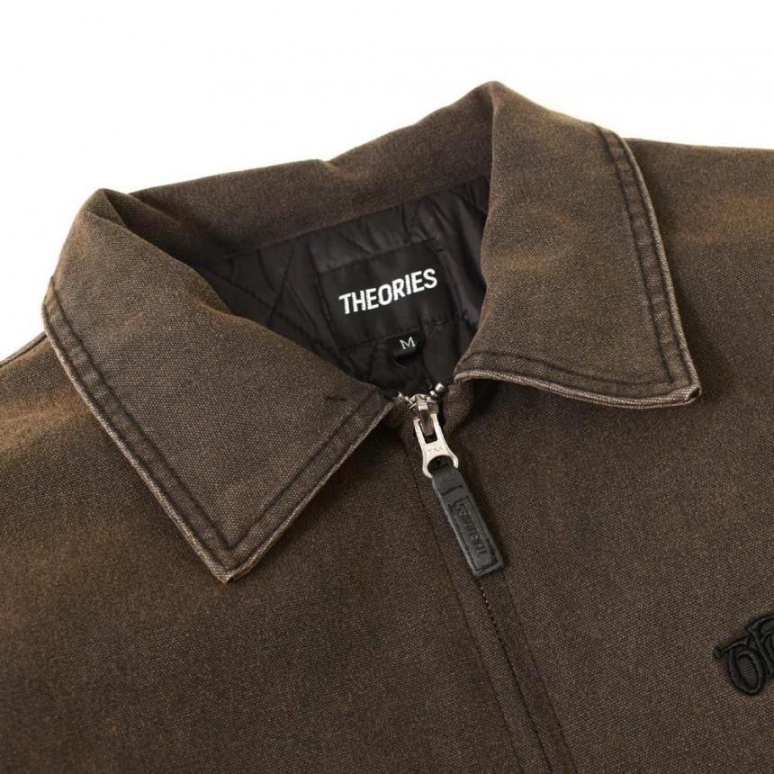 ウォッシュの効いた厚手のコットンキャンバスを使用し、左胸には"THEORIES"の文字デザインの刺繍が入った、シンプルながら味のあるルックスのワークジャケット。